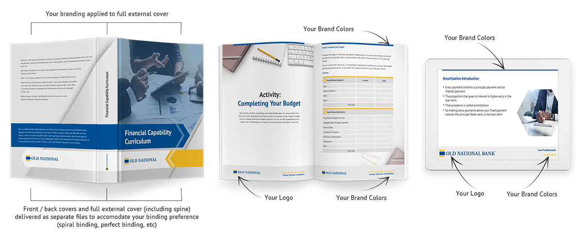 The financial literacy curriculum for high school students blends project based learning techniques, blended learning options and interactive activities. The college student financial literacy curriculum leverages similar methods.