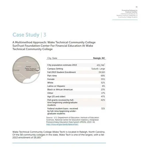 The SunTrust Foundation Center for Financial Education at Wake Technical Community College was launched in 2013 with a goal to raise financial literacy competencies among Wake Tech students, staff, and community members. The NFEC developed the programming, supplied all educational materials, and created the brand for the Center for Financial Education.