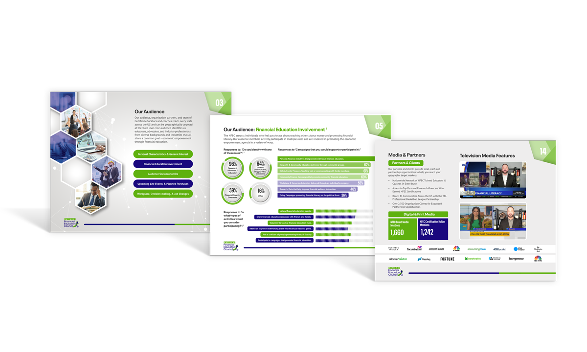 The NFEC offers fully-managed financial education campaigns and customized solutions designed to help our partners grow their businesses while advancing financial wellness in their communities. By balancing social good with business objectives, our campaigns empower you to achieve sustainable growth while making a meaningful impact. Together, we can foster financial wellness, benefiting both your community and your bottom line.